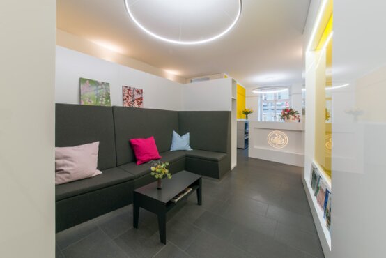 Wir nahmen dieses Goldgelb und setzen es als Kraft des Lichtes kombiniert mit den Naturelementen ein. Im anderen standen wir vor der Herausforderung den unendlichen langen Korridor auf irgendeine weise aufzulösen. Das gelang uns mit den schräggestellten Hochglanz weissen Wandelementen, die wir zusätzlich mit dem Naturelement bespielten. Im Zentrum gestalteten wir den Wartebereich, der durch die überhöhen Sitzlehnen zugleich als Raumtrenner dient. In den Toiletten spachtelten wir die bestehenden keramischen Platten und verwenden dort eine Spezialfarbe, die uns das Goldgelb wiedergeben.