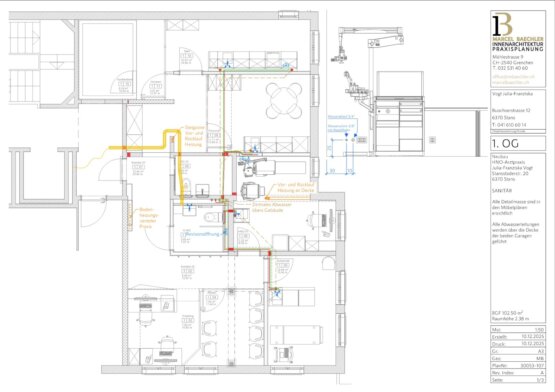 Eine der grössten Herausforderungen dieses Projekts war der Zeitrahmen. Die Auftraggeberin musste die bestehende Praxis bis vor Weihnachten 2025 verlassen. Geeignete Räumlichkeiten in dieser kurzen Zeit zu finden, erwies sich als anspruchsvoll. Ab dem Frühling 2025 wurden zahlreiche Objekte besichtigt, viele davon jedoch zu klein oder zu gross. Anschliessend bei verschiedenen Objekten Massaufnahmen, Layoutplanungen und Kostenschätzungen. Als schliesslich passende Räume gefunden waren, war der Zeitplan bereits stark fortgeschritten, sodass der Planungsstart erst im September 2025 erfolgen konnte. Dies war auch für die beteiligten Unternehmer äusserst sportlich, da diese zu diesem Zeitpunkt vielfach bereits bis Jahresende ausgebucht waren.