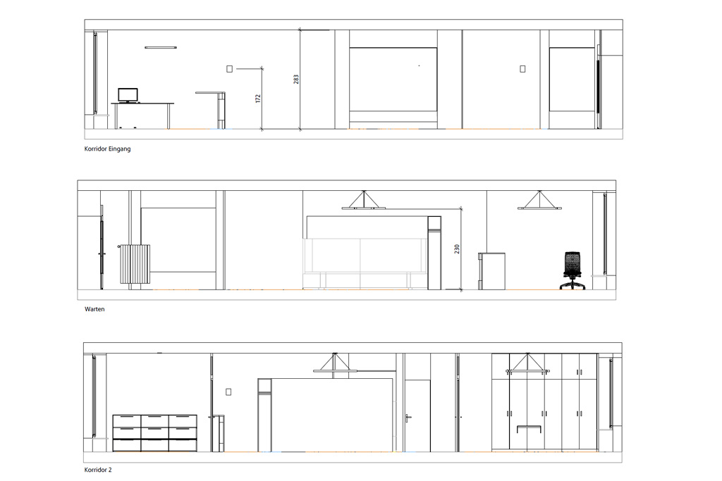 Wir nahmen dieses Goldgelb und setzen es als Kraft des Lichtes kombiniert mit den Naturelementen ein. Im anderen standen wir vor der Herausforderung den unendlichen langen Korridor auf irgendeine weise aufzulösen. Das gelang uns mit den schräggestellten Hochglanz weissen Wandelementen, die wir zusätzlich mit dem Naturelement bespielten. Im Zentrum gestalteten wir den Wartebereich, der durch die überhöhen Sitzlehnen zugleich als Raumtrenner dient. In den Toiletten spachtelten wir die bestehenden keramischen Platten und verwenden dort eine Spezialfarbe, die uns das Goldgelb wiedergeben.