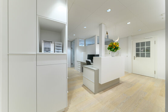Vor dem Umbau trafen wir einen grossen Raum im Stil der Endsechziger Jahre mit einem gebogenen Empfang und Backoffice an. Einen Warteraum, der zusätzlich mit einem Lager- und Putzschrank bestückt war. Eine abgehängte Tannentäfer Decke schmückte die Decke. Mit dem eleganten vorgesetzten Empfangstresen zeigen wir heute dem Patienten, wo er sich anmelden muss. Durch den durchgehenden Bodenbelag mittels Eichenparkett erhalten wir eine Durchgängigkeit im Boden und verbinden so die Räume zu einem Ganzen. Mit dem neuen zeitgemässen LED-Licht bringen wir, neben dem guten Licht, ein zusätzliches Gestaltungselement. Die grösste Herausforderung war, dass wir nur fünf Wochen Umbauzeit erhielten, was in einem solchen Projekt unrealistisch ist. Dank des Einsatzes aller beteiligten Unternehmen und den Schlussspurt über die Weihnachtstage konnten wir es trotzdem realisieren und mit sechs wochen Umbauzeit pünktlich eröffnen.
