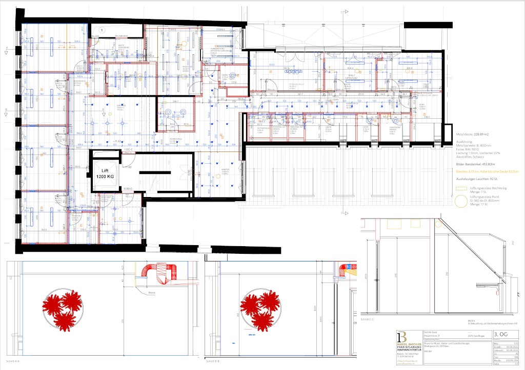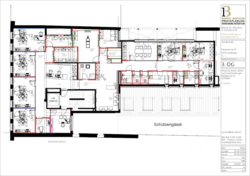 Im Auftrag von Dr. med. A. Safi und Dr. S. Safi erhielten wir die Aufgabe, das dritte Obergeschoss der Praxis für Mund-, Kiefer- und Gesichtschirurgie Craniologicum in Bern zu gestalten. Die Räumlichkeiten befanden sich zuvor in den ehemaligen Personalbereichen des Coop. Unser Verantwortungsbereich umfasste die gesamte Entwurfs- und Ausführungsplanung, einschliesslich der Sanitär- und Elektroplanung.
