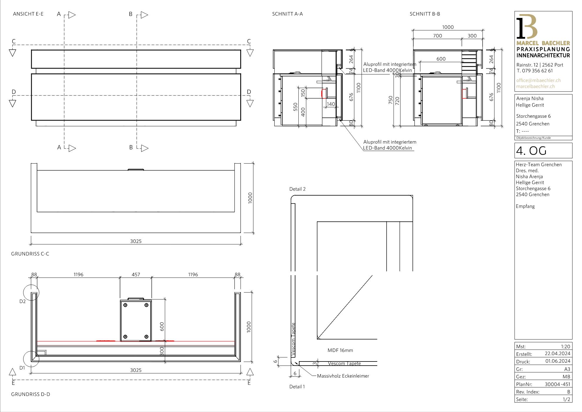 Wir entschieden uns, die Wände in einem sanften weiss zu streichen, um den Räumen eine helle und luftige Ausstrahlung zu verleihen. Ein kräftiges Rot wurde strategisch platziert, um Energie und Dynamik zu vermitteln – Eigenschaften, die besonders in einer Kardiologie-Praxis wichtig sind. Diese roten Elemente sollten nicht nur auffallen, sondern auch ein Gefühl von Vitalität und Lebensfreude ausstrahlen.