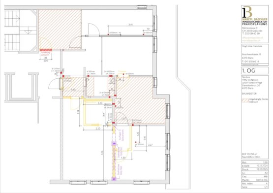 Dank unseres eingespielten Netzwerks gelang dennoch der Spagat zwischen "fliegender" Planung und Baubeginn. Das Bauamt Stans begleitete das Projekt von Beginn an konstruktiv, wodurch das Baugesuch bewusst schlank gehalten werden konnte. Mit dem Vertrauen aller Beteiligten und einer Auftraggeberin, die das mutige Farbkonzept von Anfang an mitgetragen hat, konnte der Umbau eines ehemaligen Büros – inklusive der Anpassung einer tragenden Wand – innerhalb von sieben Wochen erfolgreich realisiert werden.